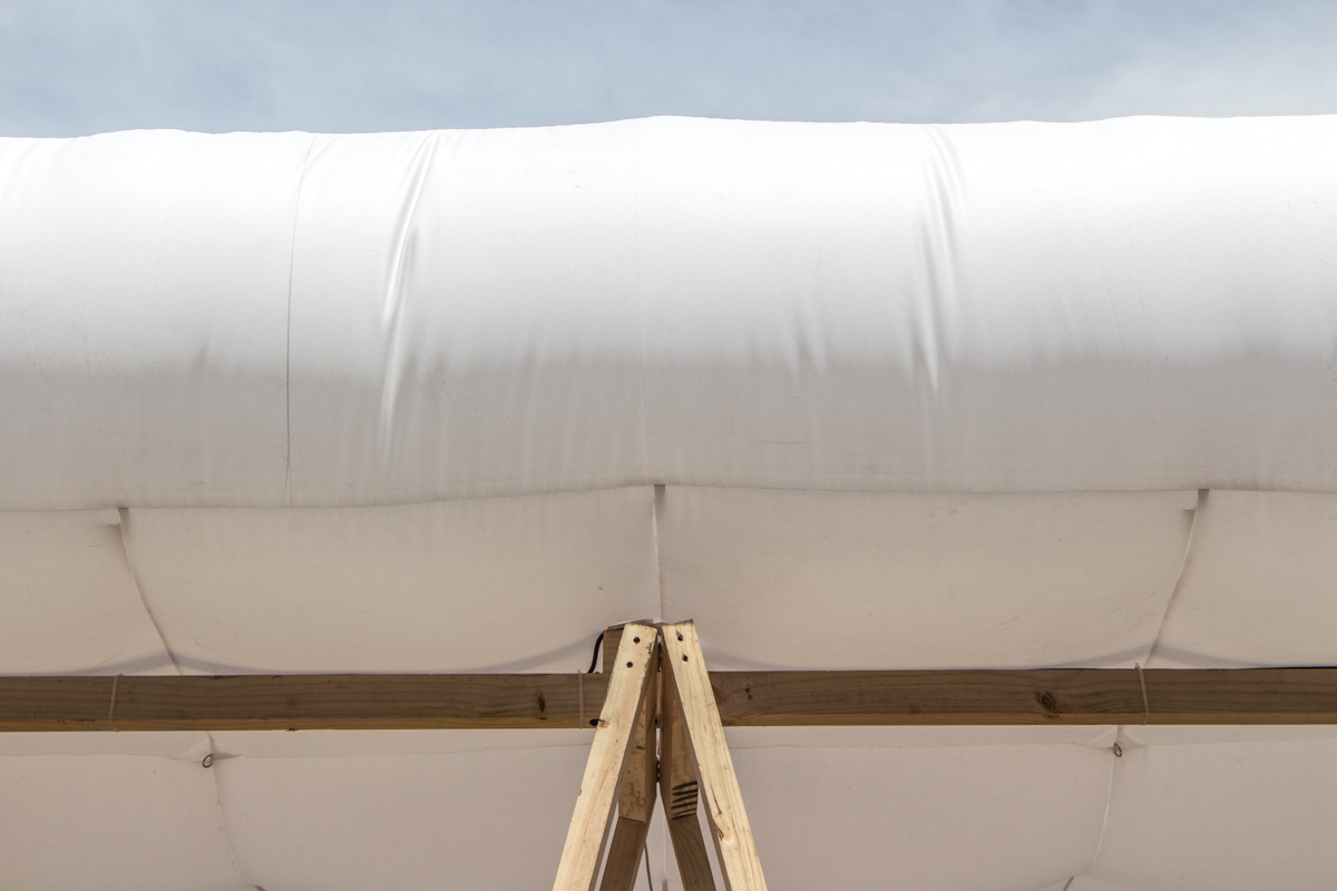 El colchón inflable, de 90 centímetros de espesor, es sostenido por esta viga perimetral, creando una cubierta traslúcida de color blanco permitiendo la entrada de una luz tamizada, difusa, y suave.